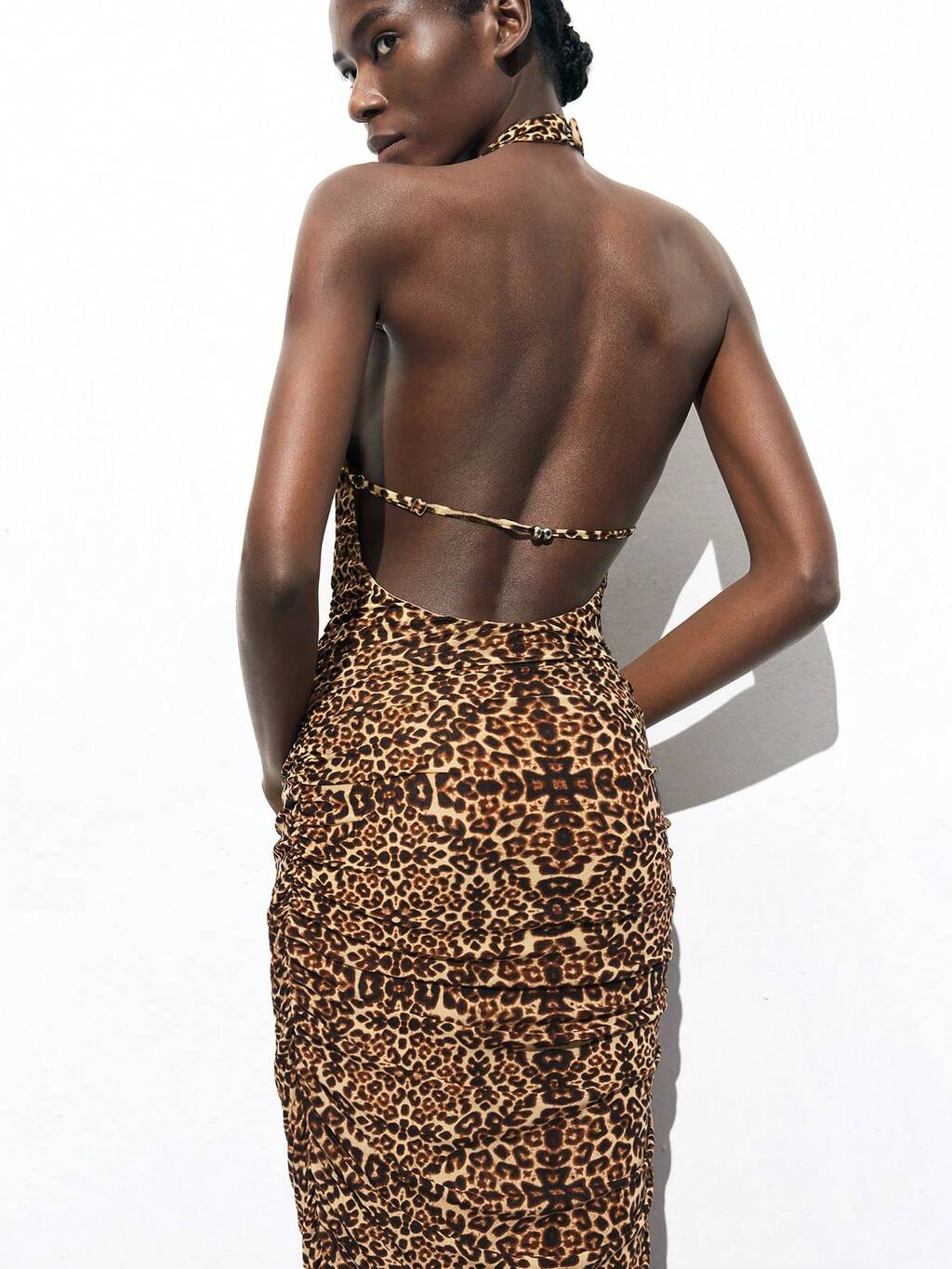 SHEIN Maija 2025年夏新作 ファッションバケーションスタイリッシュウエストニッパードワンピース、ビーチ、ミュージックフェス、オフィス向け、エレガントなレオパード柄サイドタックバックオープンドレス、カジュアルシックな夏の装い