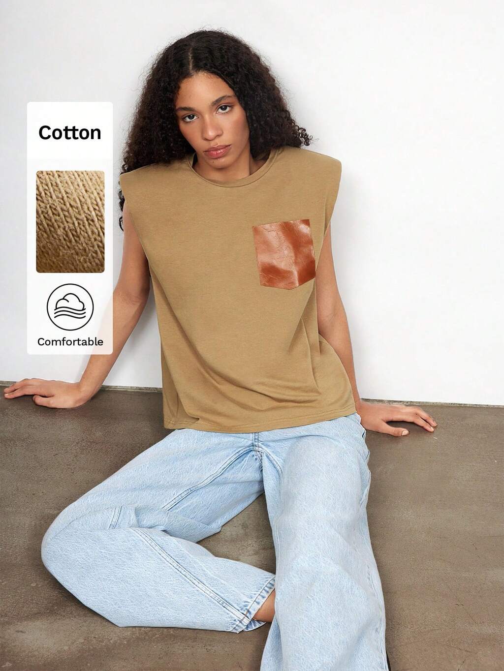 SHEIN Maija カーキフェイクレザー切り替えパッド入り ノースリーブ レディース タンクトップ、快適な肌ざわりの ファッション 多目的 スリムフィット カジュアル 普段着