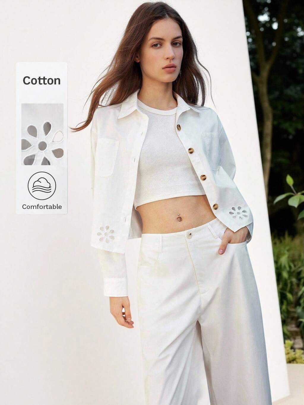 SHEIN Maija 2025 클래식 자수 홀로 헴 천연 섬유 편안한 루즈 화이트 기본 여성용 재킷, 초가을 휴가에 적합 화이트 화이트 크롭 탑 재킷 화이트 크롭 재킷 화이트 화이트 버튼 업 재킷 자수 면직물 외출