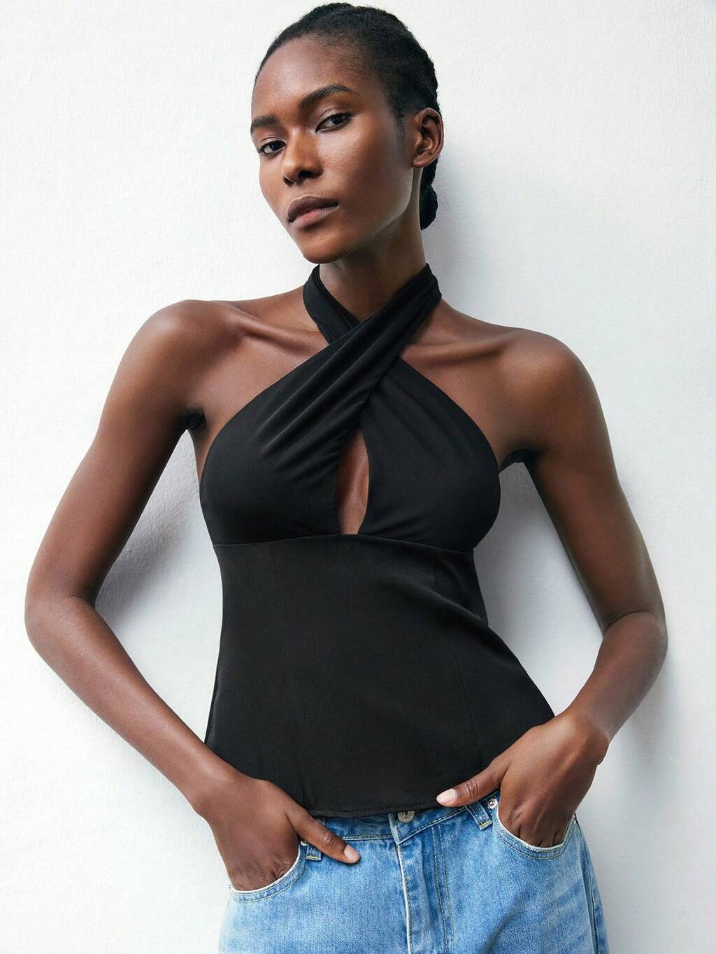 SHEIN Maija 퍼플 메쉬 크리스-크로스 타이 넥 컷아웃 백리스 크롭 탑, 캐주얼 & 미니멀리스트 어반 스타일, 여성용 가을 캐주얼 올드 머니 파티 탑 여성용 추수감사절 할로윈 의상 여성