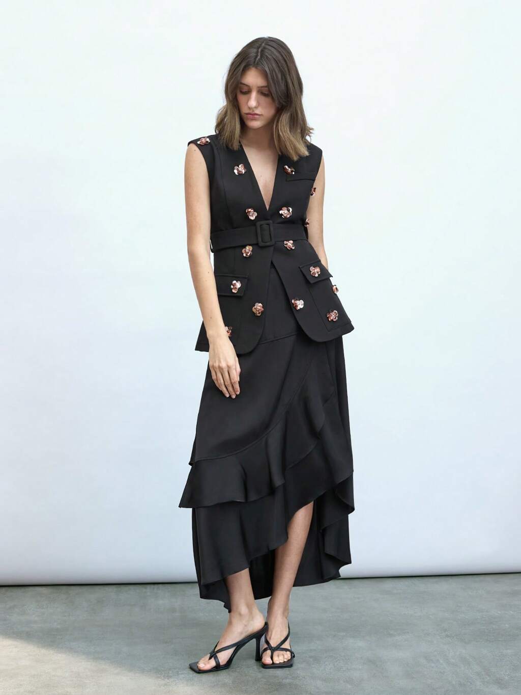 SHEIN Maija 우아한 여성용 봄 플로럴 메탈릭 3D 장식 깊은 V넥 민소매 조끼 재킷, 부활절, 뮤직 페스티벌, 파티에 적합