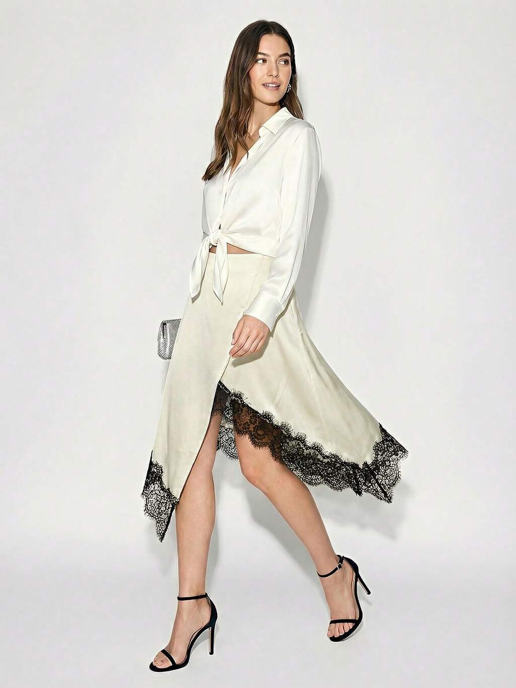 SHEIN Maija 여성용 비대칭 대비 레이스 밑단, 우아하고 로맨틱한 피티드 비대칭 레이스 밑단 하이 슬릿 허리 엘라스틱 허리 A라인 스커트, 봄/여름 성 패트릭의 날 여성 부활절 여름 부활절 여성 파티 탑 비치 여름 휴가 각 여성용 여름 여성용 외출 졸업 졸업 캐주얼 캐주얼 블라우스 여성용