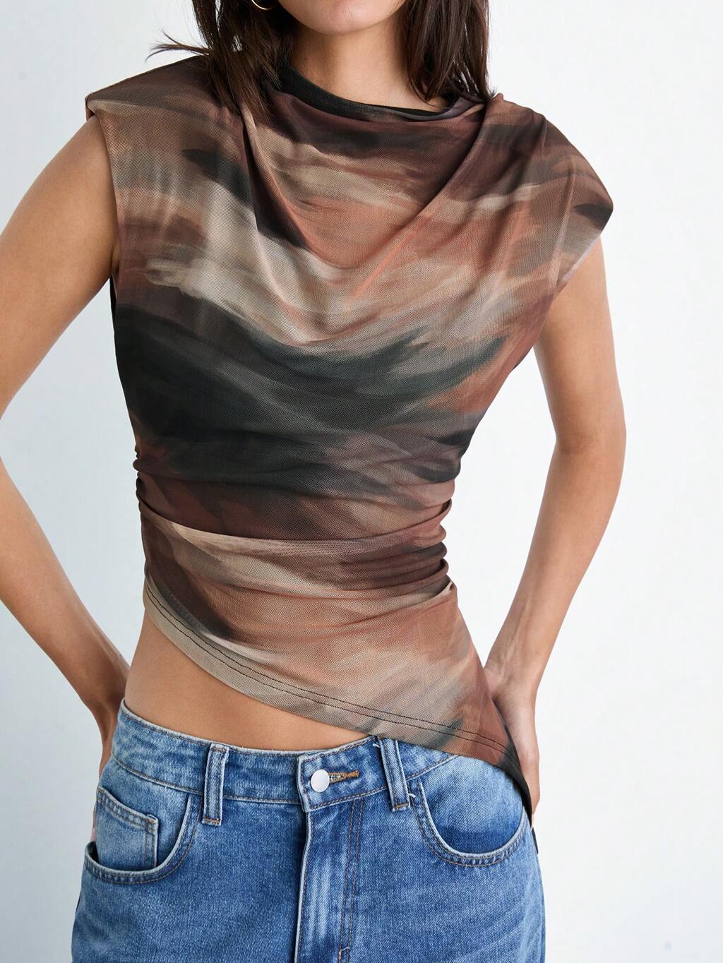 SHEIN Maija 여성 타이 다이 마블 프린트 크루넥 숄더 패드 비대칭 밑단 캐주얼 탑, 봄, 생일, 클럽, 선생님을 위한 다용도