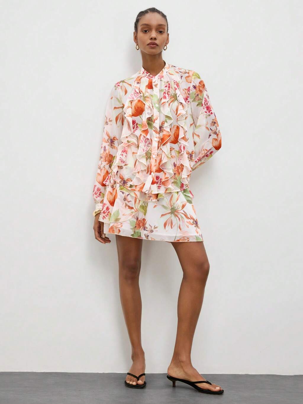 SHEIN Maija 여성용 다채로운 타이다이 디자인 루즈핏 편안한 시어 쉬폰 크루넥 드롭 숄더 긴팔 프릴 헴 우아하고 스타일리시한 로맨틱 캐주얼 드레스