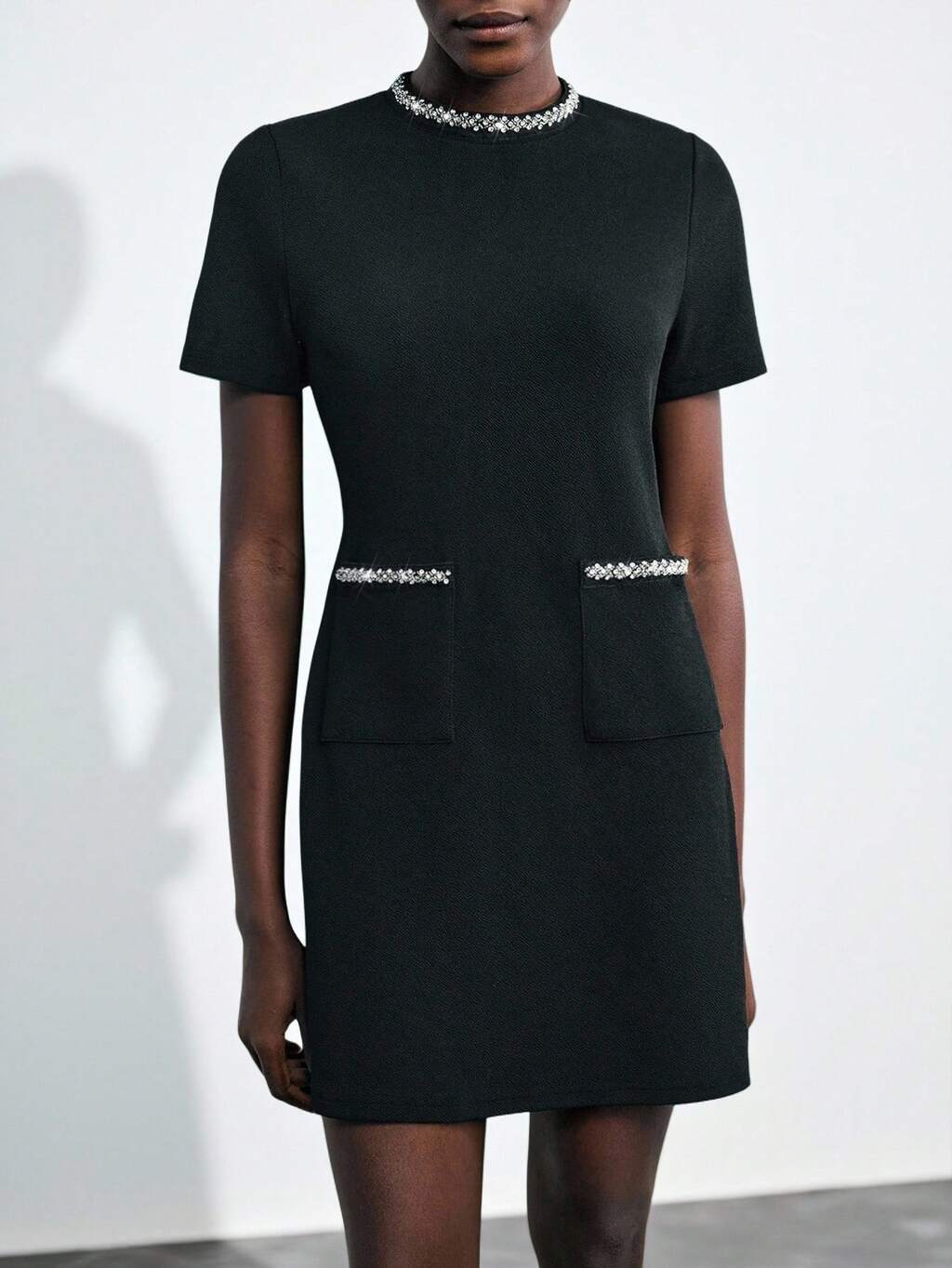 SHEIN Maija 2025년 현대 도시 라인스톤 칼라 & 포켓 여성용 우아한 짧은 드레스, 초가을 파티 시즌에 적합