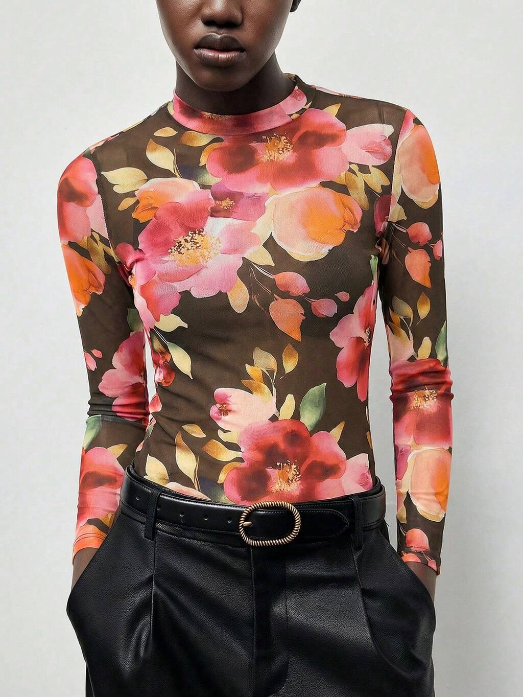 SHEIN Maija 여성용 단색 미니멀리스트 캐주얼 스탠드 칼라 시스루 긴팔 상의 시스루 상의 메시 상의 긴팔 투명 상의