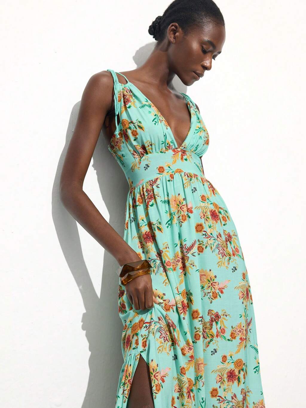 SHEIN Maija 2025년 봄 & 여름 신상 캐주얼 패션 해변 리조트 초록색 플로럴 프린트 리본 디자인 여성용 맥시 드레스, 편안한 일상적인 캐주얼 로맨틱 휴가 의상으로 외출, 파티, 결혼식, 데이트, 음악 축제, 졸업식에 적합