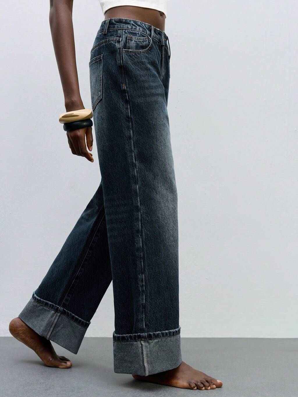 SHEIN Maija 여성 캐주얼 패션 루즈 미니멀리스트 커프드 와이드 레그 청바지