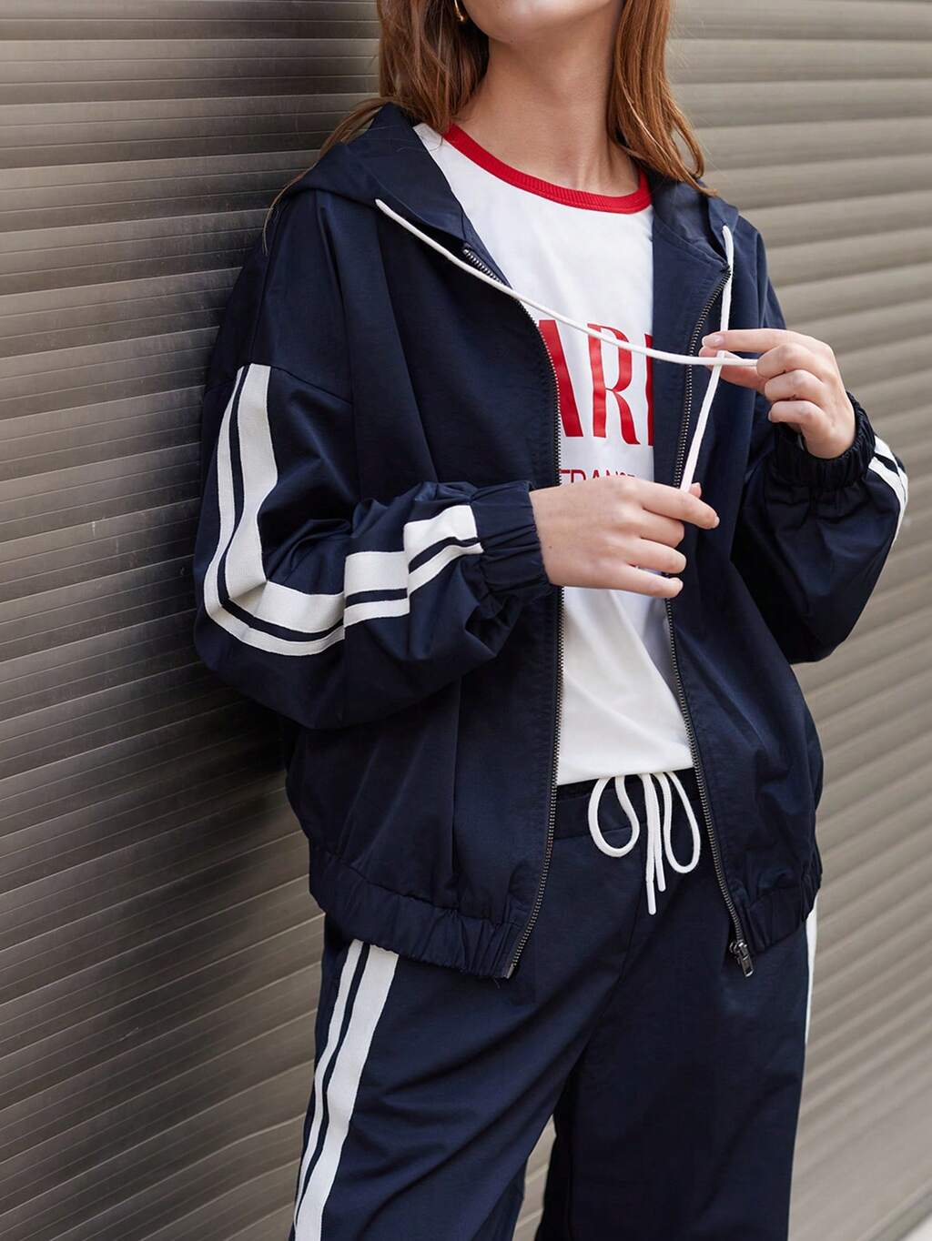 SHEIN Maija 여성 네이비 블루 & 화이트 스트라이프 드롭 숄더 사이드 심 프론트 지퍼 장식 캐주얼 재킷, 다용도 올 시즌 후드 스웨트셔츠 히피