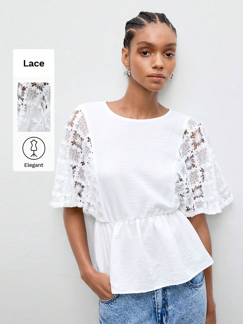 SHEIN Maija Deas For White Round Neck Ruffle Sleeve Top For Women, Spring/Summer Vacation Work For Women White Summer Top Lace Tshirt Latest Tops For Women New Arrivals