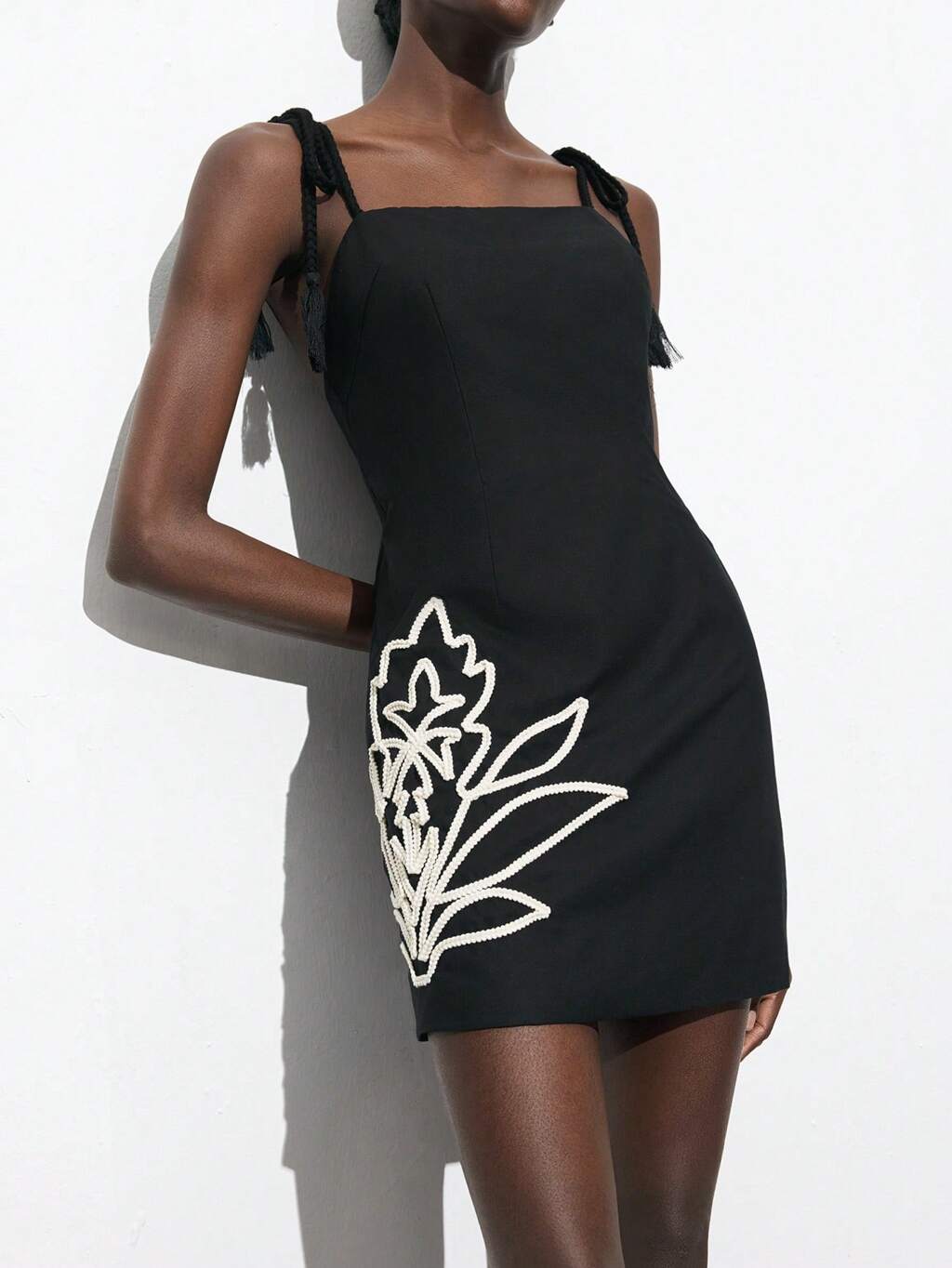 SHEIN Maija Women's Black Floral Embroidery Spaghetti Strap Tie Waist Bohemian Style Short Dress, Elegant Beach Vacation, Suitable For St. Patrick's Day, Spring Break, Easter, Music Festival