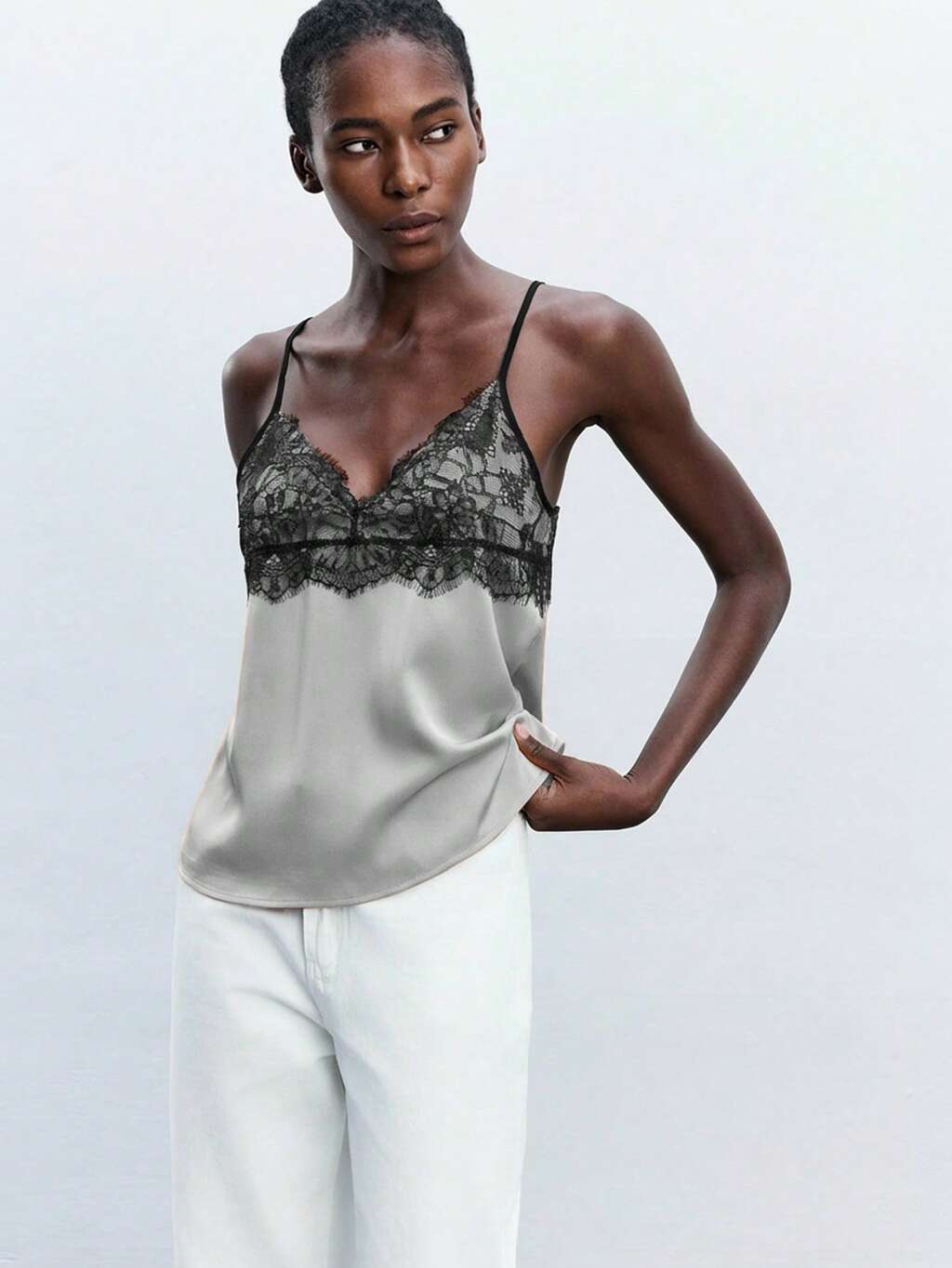 SHEIN Maija Women's Gray Lace Patchwork Top, Elegant Romantic Chic Comfortable Loose V-Neck Adjustable Spaghetti Strap Vacation Business Casual Western Style Cruise Wear Versatile Sleeveless Top St Patrick's Day Women Easter Summer Outfits Easter Dress Women Party Top Beach Dress Summer Holiday Outfits Each Vacation Outfits For Women Summer Outfit For Women Going Out Outfits Graduation Graduation Outfit Casual Dresses Casual Blouses For Women,Summer Top
