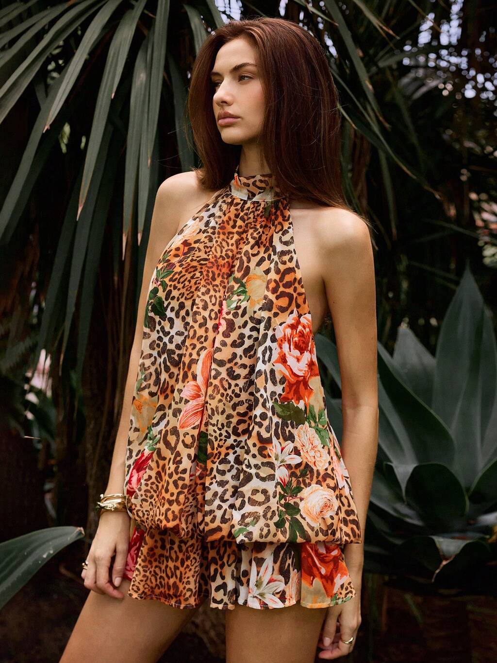 SHEIN Maija Women's Sexy Backless Halter Neck Floral & Leopard Print Beach Vacation Dress, Summer Dress, Summer Outfits, Summer Dresses For Women, Summer Clothes, Summer Outfit For Women, Spring Clothing, Spring Dress , Spring Women, Festival Dress, Elegant Dresses For Party, Elegant Party Dresses, Wedding Guest Dress For Women, Wedding Party Dress, Weddings & Events, Bridesmaid Dress, Wedding Guest Party Dress, Leopard Print And Floral Dress, A Mini Dress Shaped Like A Flower Bud