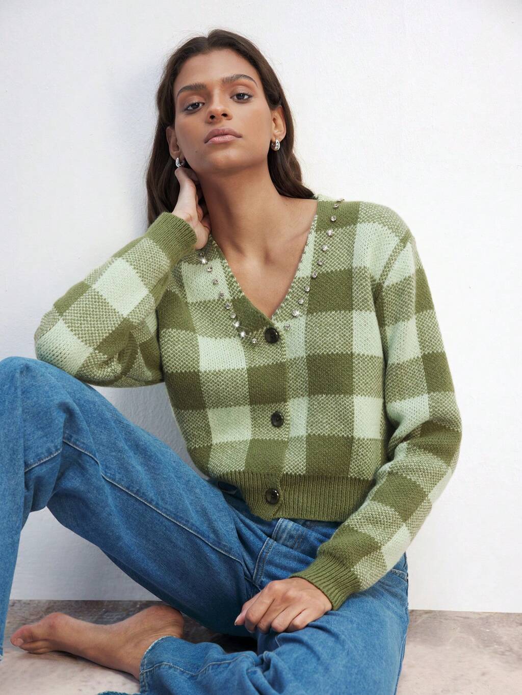 SHEIN Maija Women's Plaid V-Neck Long Sleeve Single Breasted Casual Cardigan, Autumn/Winter