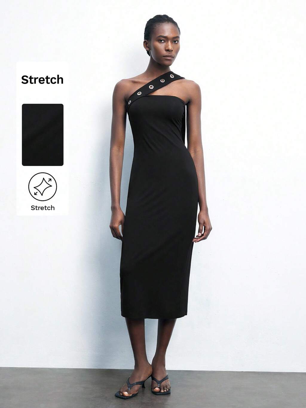SHEIN Maija Women's Black Urban Chic Sexy Commuter Solid Color Spaghetti Strap Metal Hollow Out Decor Asymmetric Midi Fitted Dress, For Outdoor Music Festivals