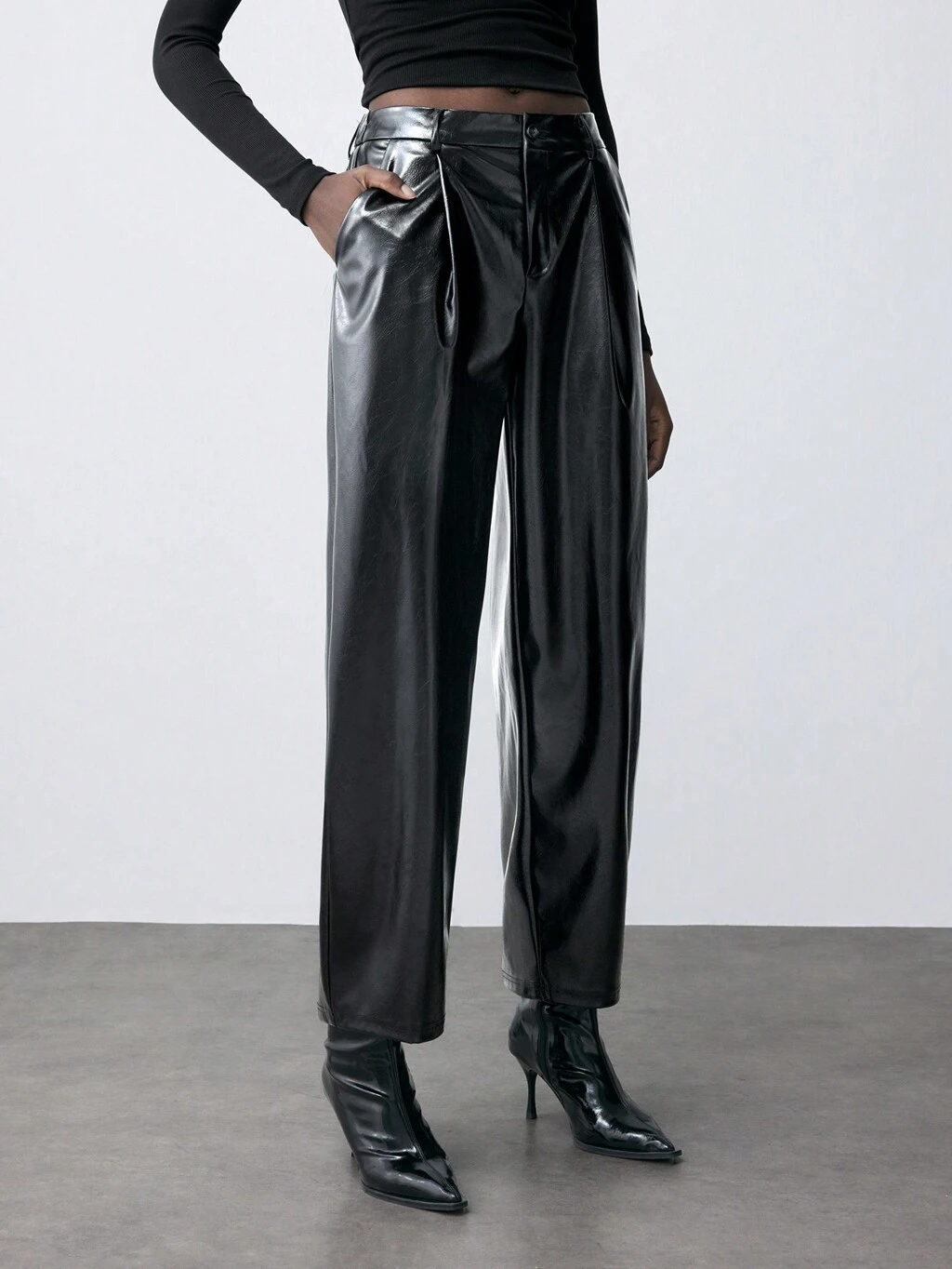 SHEIN Maija Women's Shiny PU Leather High Waisted Elastic Waist Black Pants, For Autumn/Winter