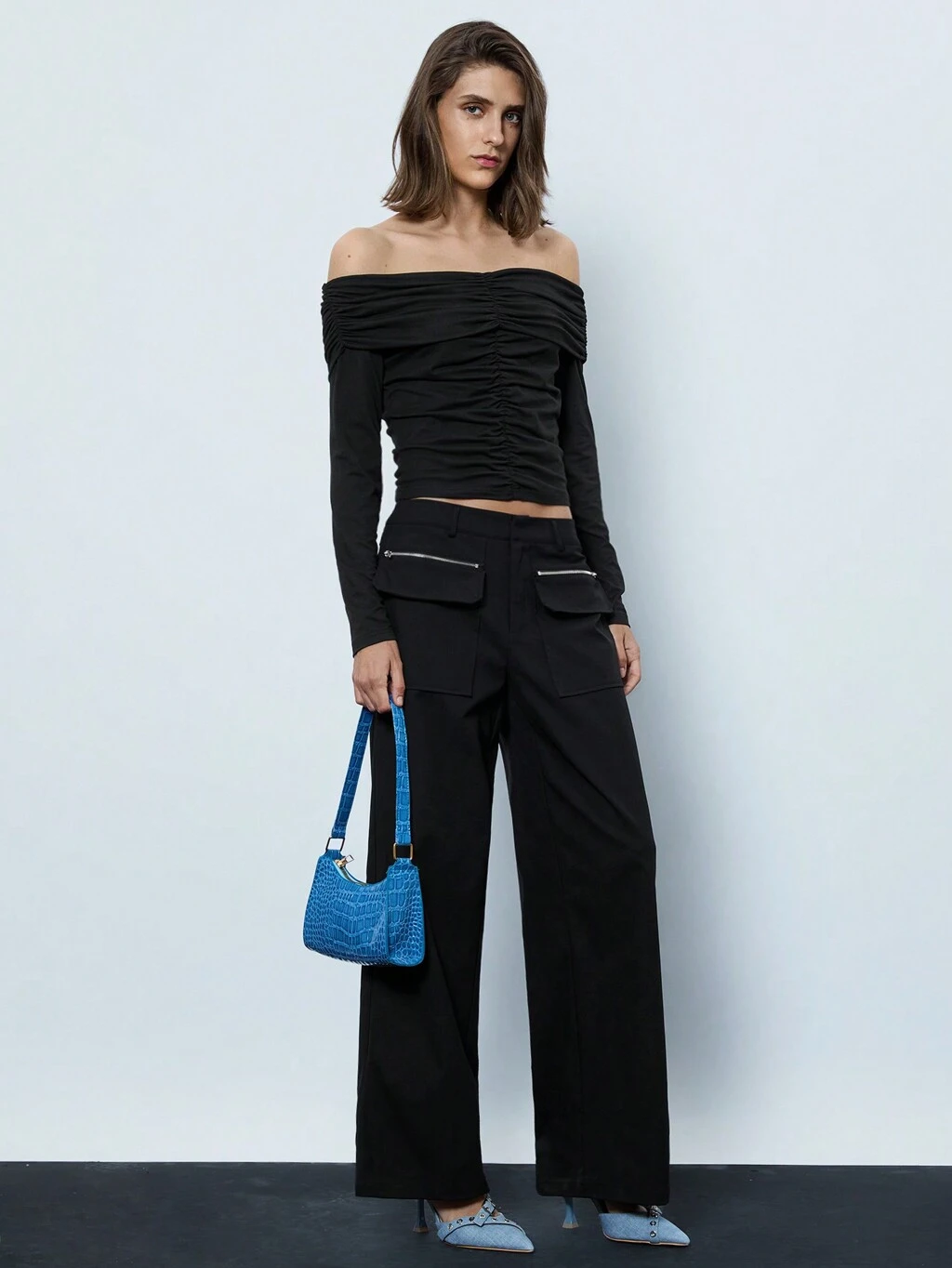 SHEIN Maija Women's Wide Leg Loose Fit Elegant Office Trousers With Pockets & Rhinestone Decor