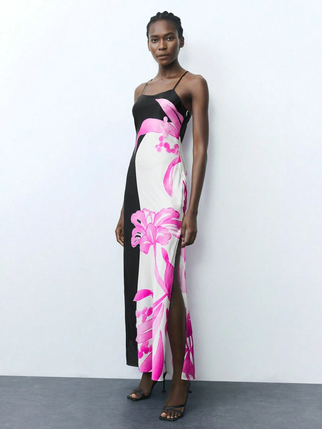 SHEIN Maija Women Spaghetti Strap Backless Floral Print Color Block Fitted Slit Dress Floral Dress