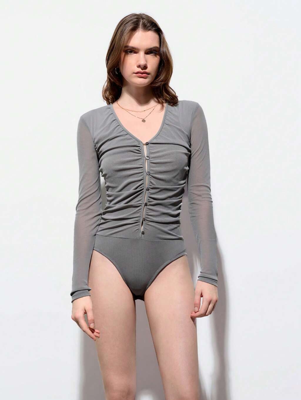 SHEIN Maija Szary, uniwersalny, nowoczesny, miejski, swobodny, modny design z błyszczącymi kryształkami, opadającymi ramionami, skrócony top z długim rękawem, hipisowski na każdą porę roku