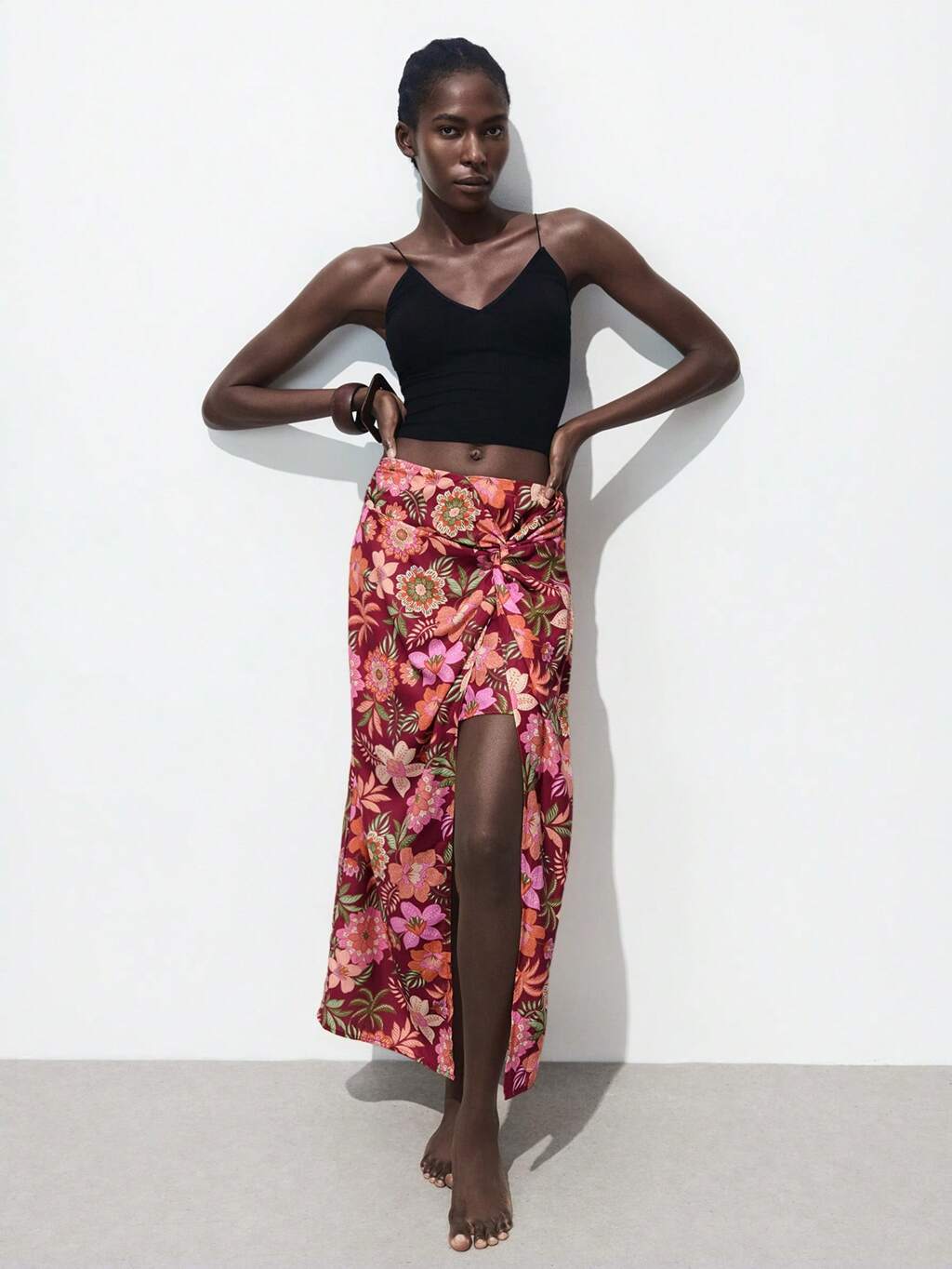 SHEIN Maija Damska spódnica w czerwonym kwiatowym stylu z węzłem i rozcięciem na dole