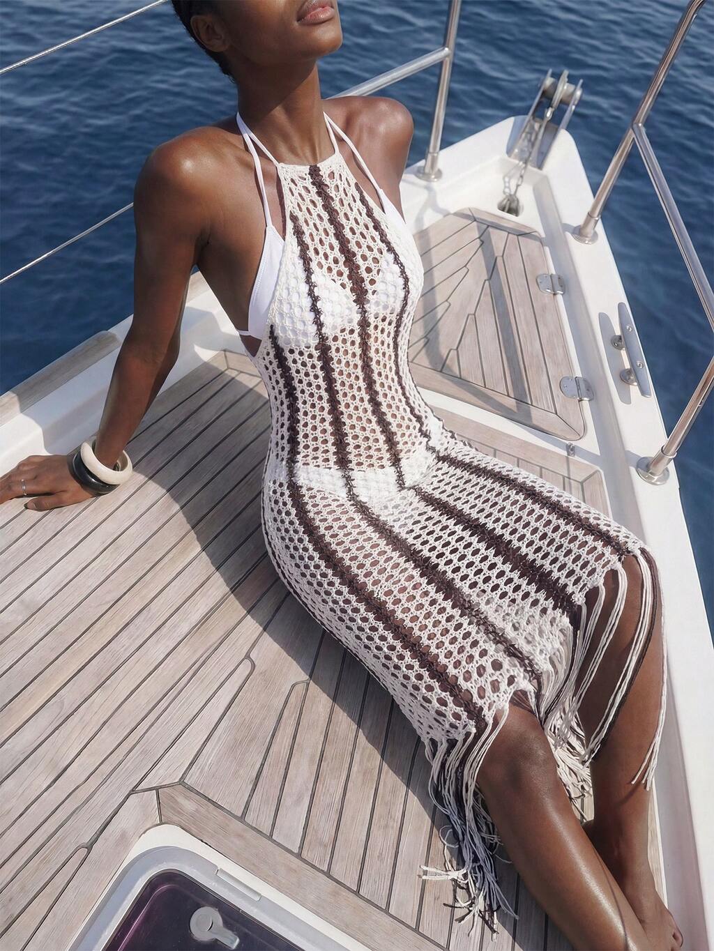 SHEIN Maija Damska narzutka na plażę w blokach kolorów, w paski, z wycięciami i frędzlami, z odkrytymi plecami i wiązaniem na szyi