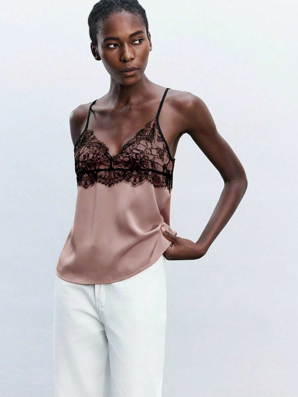 SHEIN Maija Damski luźny top bez rękawów z koronką kontrastową i falbanką u dołu