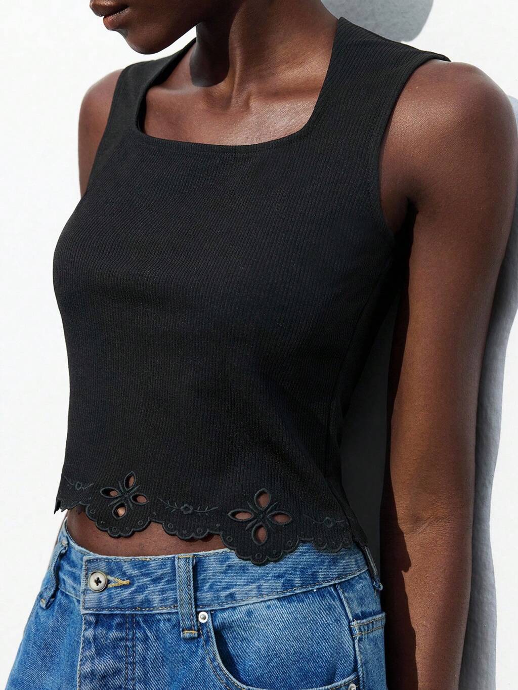 SHEIN Maija Letni nowy festiwal muzyczny 2025, impreza, ukończenie szkoły, wakacje na plaży, brunch, vintage, boho, szykowny, retro, kwadratowy dekolt, haftowany brzeg, czarny top bez rękawów dla kobiet