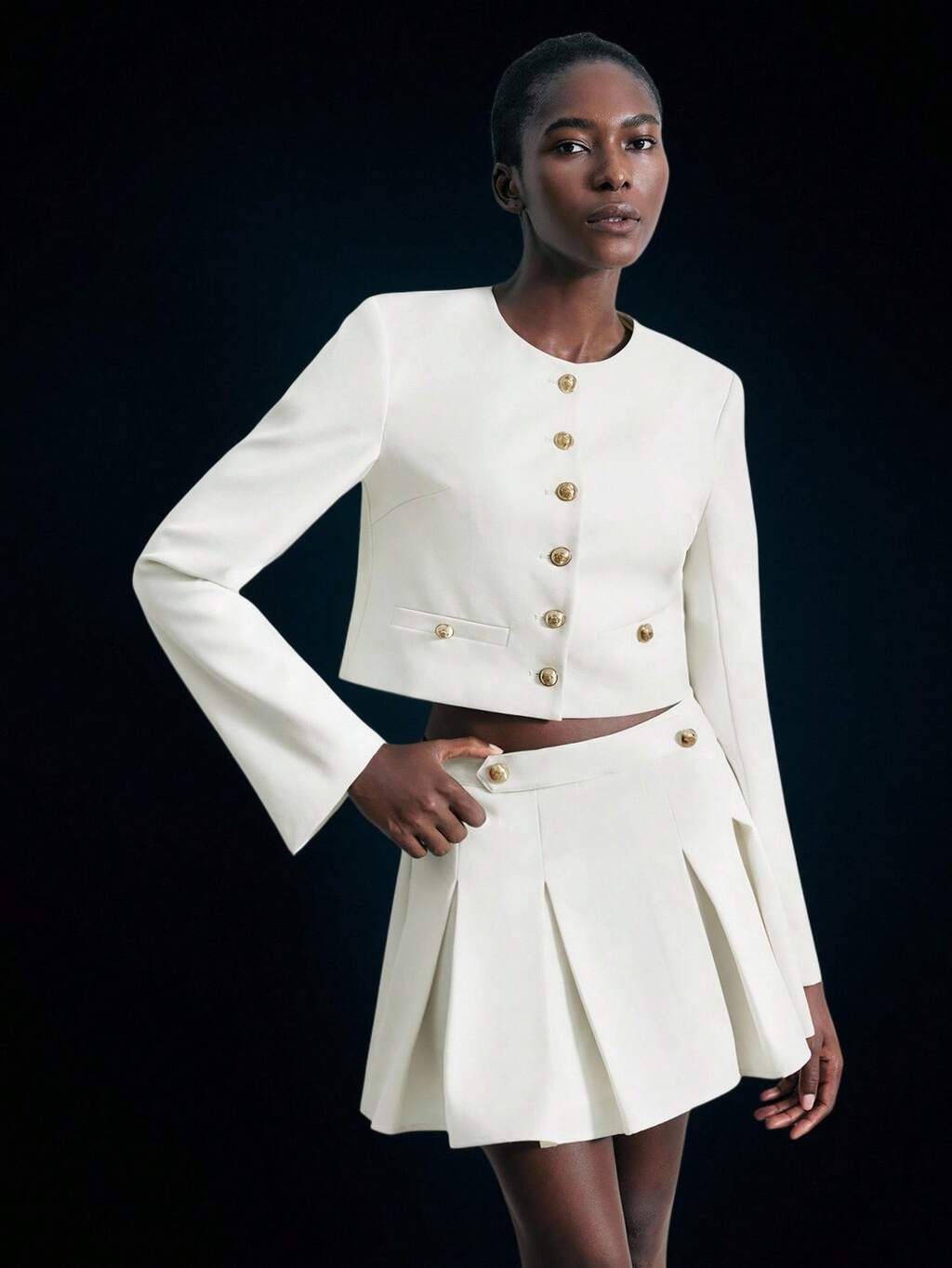 SHEIN Maija 2025 Klasyczna, luźna, skrócona kurtka żakardowa z okrągłym dekoltem dla kobiet, odpowiednia na wczesną jesień, powrót do szkoły, 2025 Biały, Metalowy guzik, Elegancka, Jesienna, zimowa odzież wierzchnia, Miejski swobodny styl, Odpowiednia na świąteczną kolację, spotkania rodzinne, walentynkowe, ukończenie szkoły, Święto Narodowe, styl starych pieniędzy
