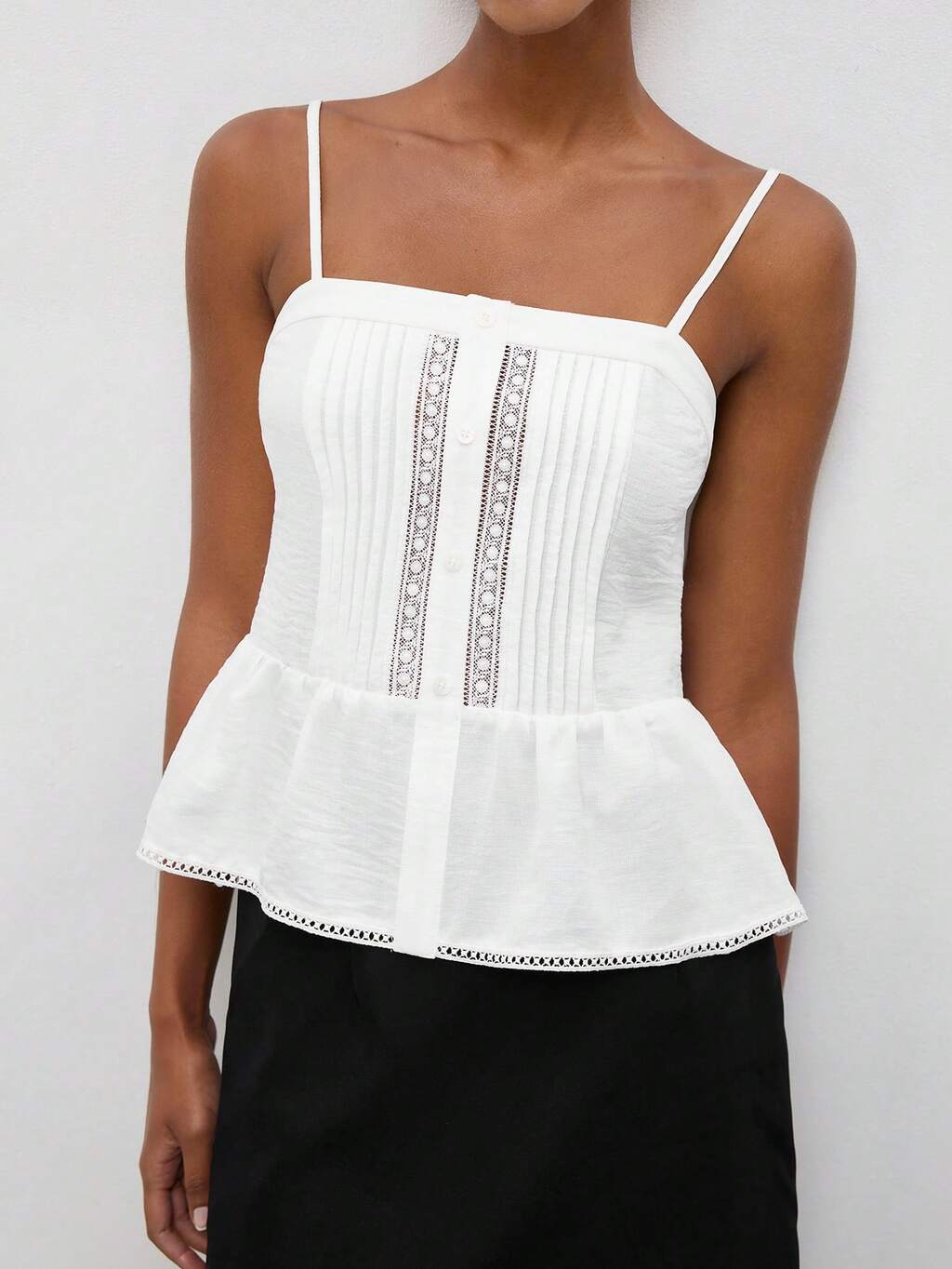 SHEIN Maija Pomysły na topy, francuski retro jednokolorowy top z koronką i falbanką, biały top, letnie stroje, stroje festiwalowe dla kobiet, stroje wakacyjne dla kobiet, letnie stroje wakacyjne, biały elegancki top, biały top na ramiączkach spaghetti, damski biały top, damskie topy na lato