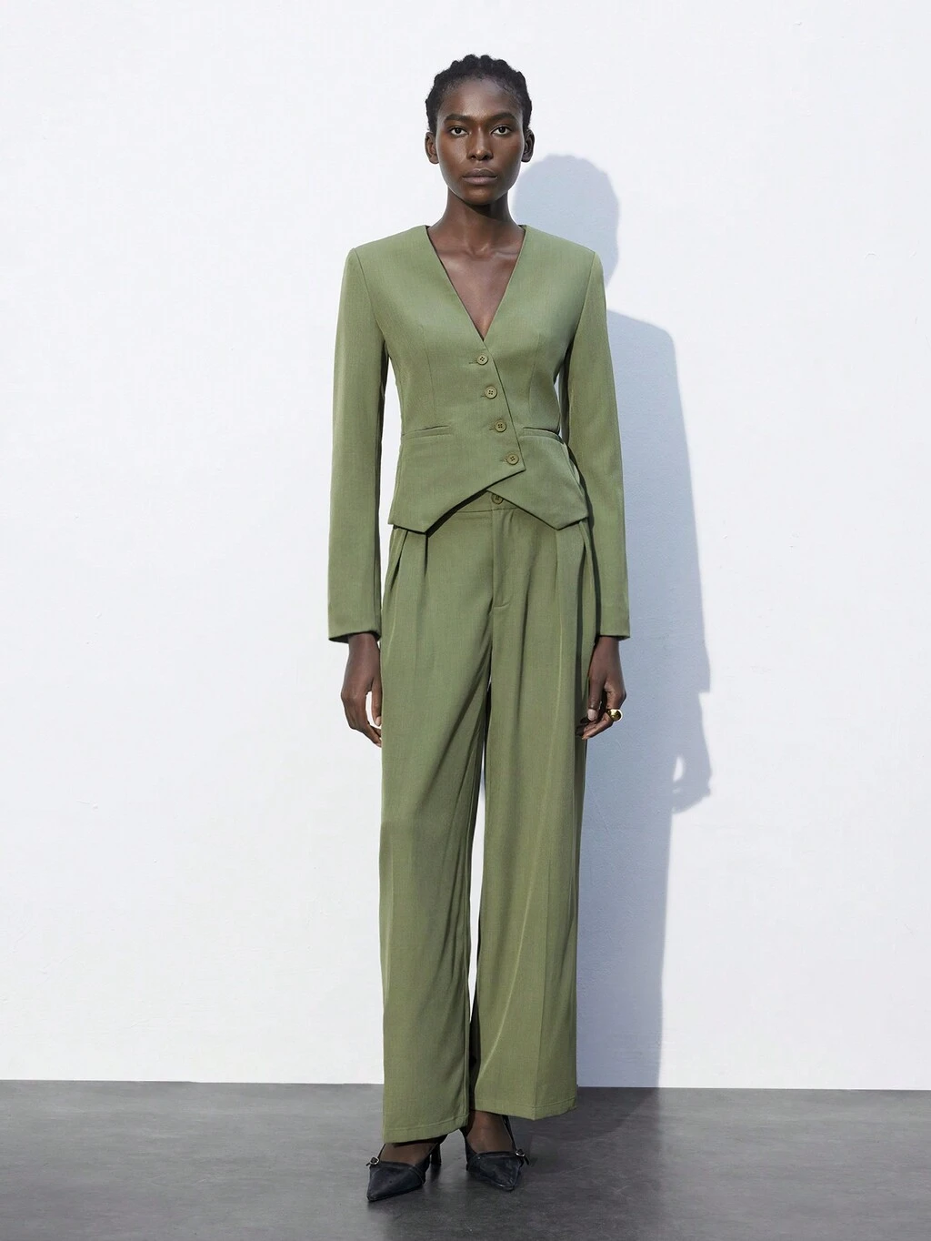 SHEIN Maija Damskie, jednokolorowe, zielone, plisowane, wiązane spodnie casualowe, jesień/zima
