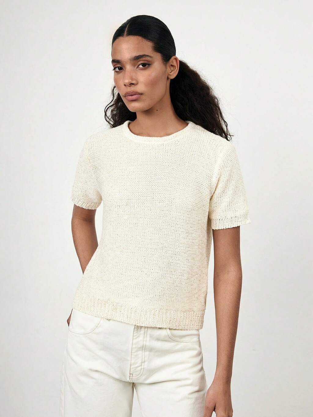 SHEIN Maija 2025 Lato Nowy Dzianinowy Koronkowy Patchwork Krótki Rękaw Top, Nowoczesny Elegancki Biurowy Damski Moda Dojazd Minimalistyczny Cekinowy Szydełkowy Dzianinowy Festiwal Muzyczny Plaża Wakacje Swobodny Miejski Ośrodek Odpowiedni Na Wyjście, Imprezę, Wesele, Gościa, Ukończenie Szkoły Senior Styl Dla Kobiet