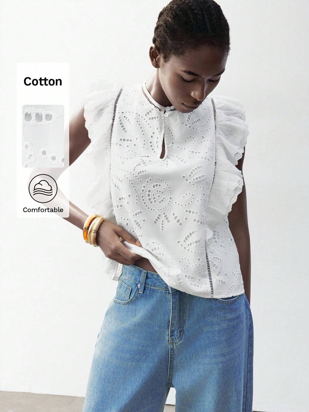 SHEIN Maija 2025 Lato Nowy Elegancki Oczko Haft Hollow Koronka Falbana Bez Rękawów Bluzka, Nadaje Się Na Festiwal Muzyczny, Wakacje Na Plaży, Codzienne Codzienne, Romantyczne Miejskie Wakacje, Imprezę Ukończenia Szkoły, Plażę/Pływanie, Styl Boho, Euforyczne Wakacje