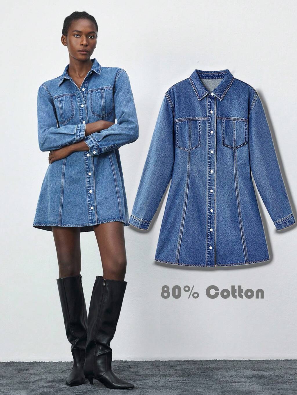 SHEIN Maija Vestido Denim Casual de Manga Longa e Cor Sólida para Mulheres