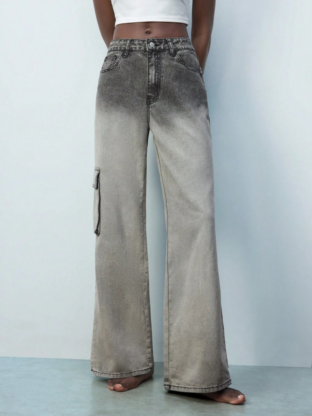 SHEIN Maija Calça Feminina com Bolsos Cargo, Lavada em Degradê Cinza, Cintura Média, Vestuário Ocidental Feminino