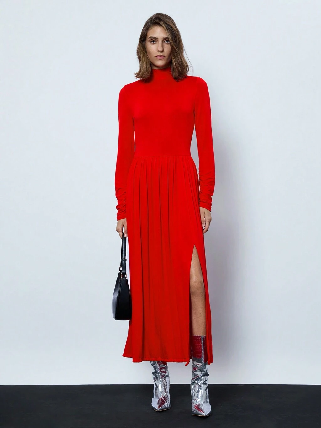 SHEIN Maija Vestido Sólido Feminino com Gola Alta, Mangas Longas e Barra Lateral Fendida, Vestido Elegante de Primavera e Verão Vestido de Malha